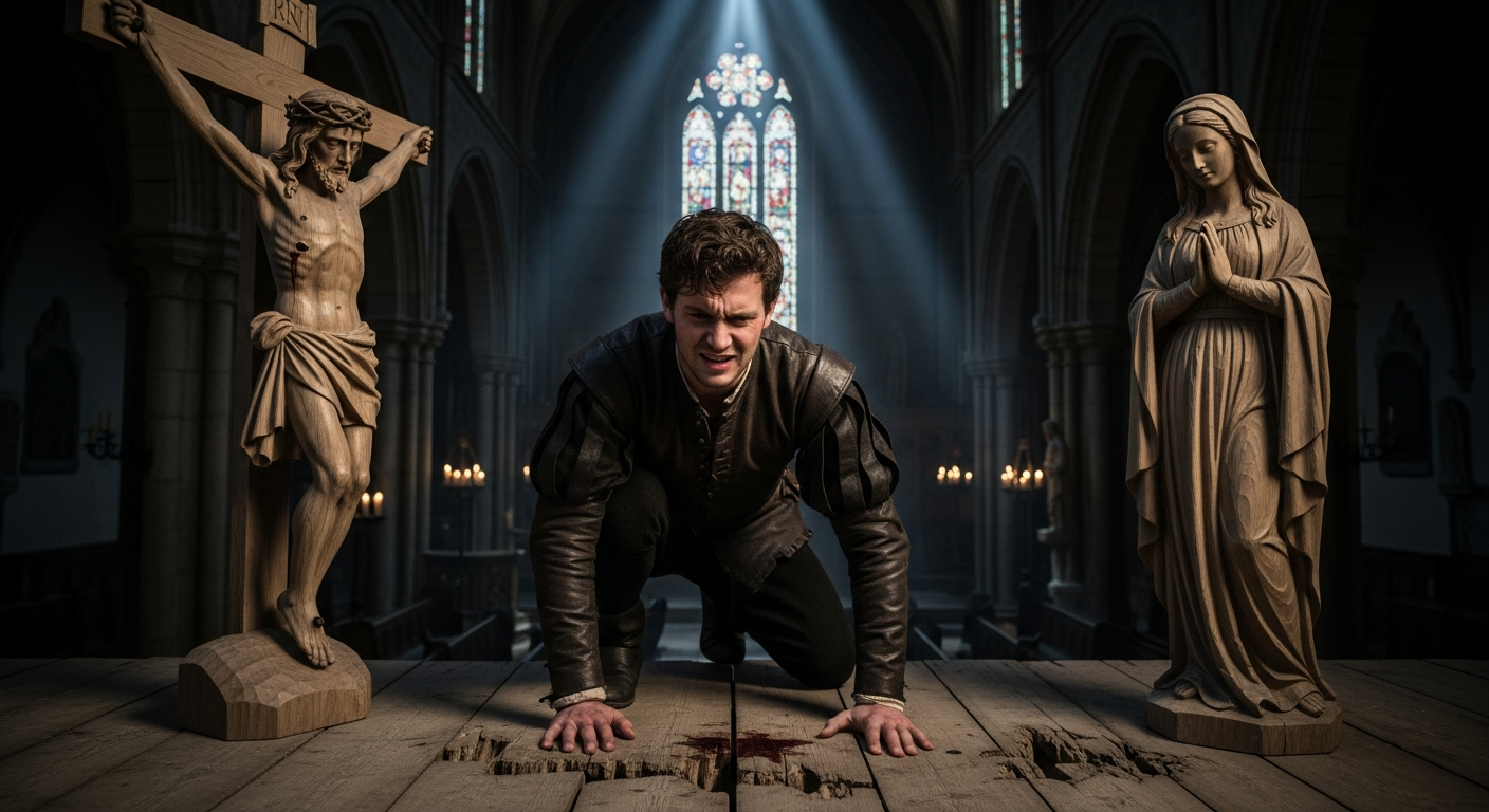 After kneeling for so long, his knees creaked when he tried to stand, and he might have fallen had he not braced himself against Mary’s flank. As he limped toward the stairwell, his bloody palm-print gleamed wetly on the statue’s blue-painted robe, illuminated by a shaft of sunlight that pierced the stained glass of the chancel’s window.
